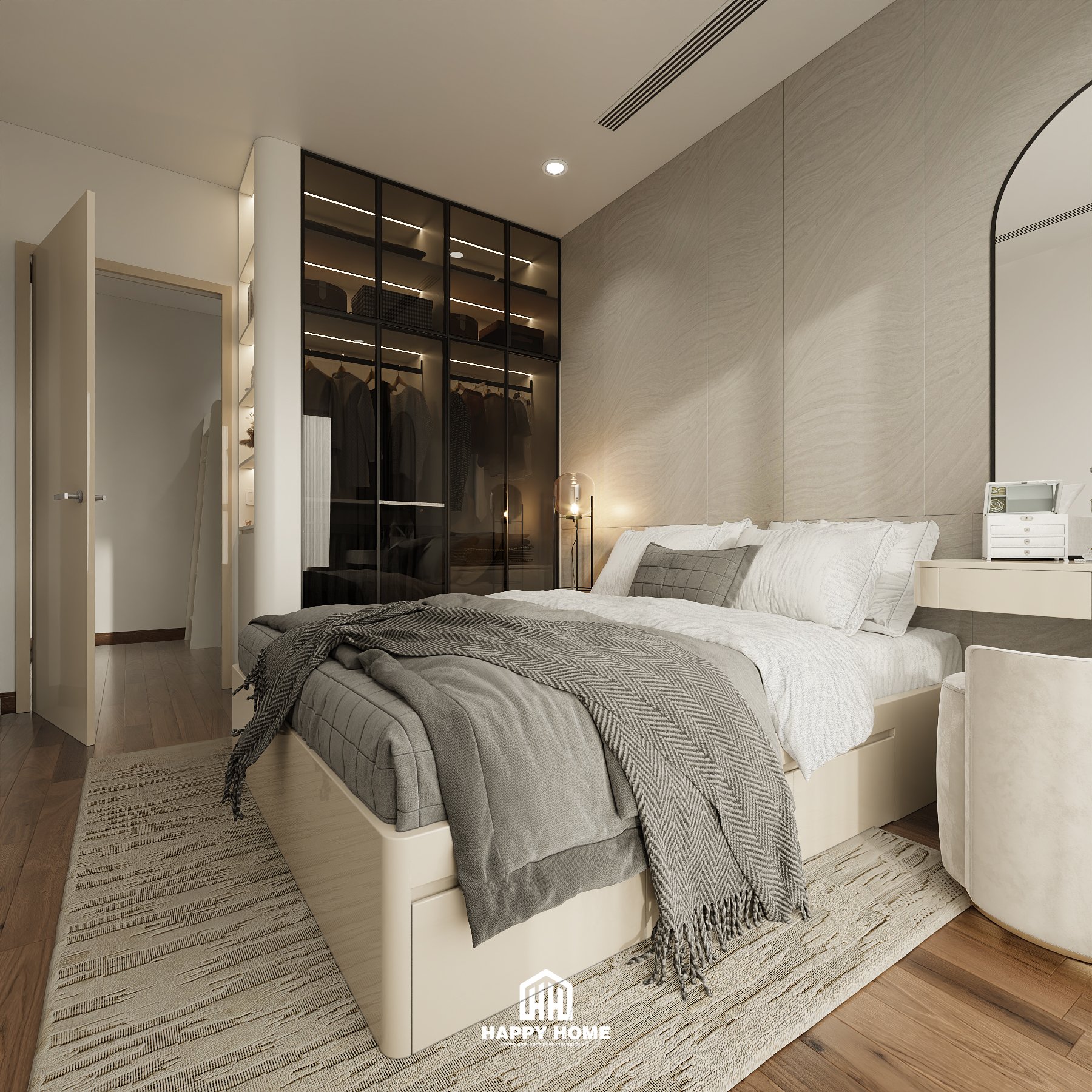 Gác lại những bộn bề công việc bên ngoài, khi trở về không gian riêng tư. Phòng ngủ phong cách hiện đại đem đến cảm giác thư thái, giúp khách hàng tận hưởng được những cảm giác bình yên. Các gam màu nhẹ nhàng, tươi tắn, trẻ trung như trắng, be, ghi thường được chọn trong nội thất phòng ngủ. Bởi nó toát lên vẻ đẹp gần gũi, tự nhiên nhưng lại không kém phần ấm cúng, đẳng cấp.