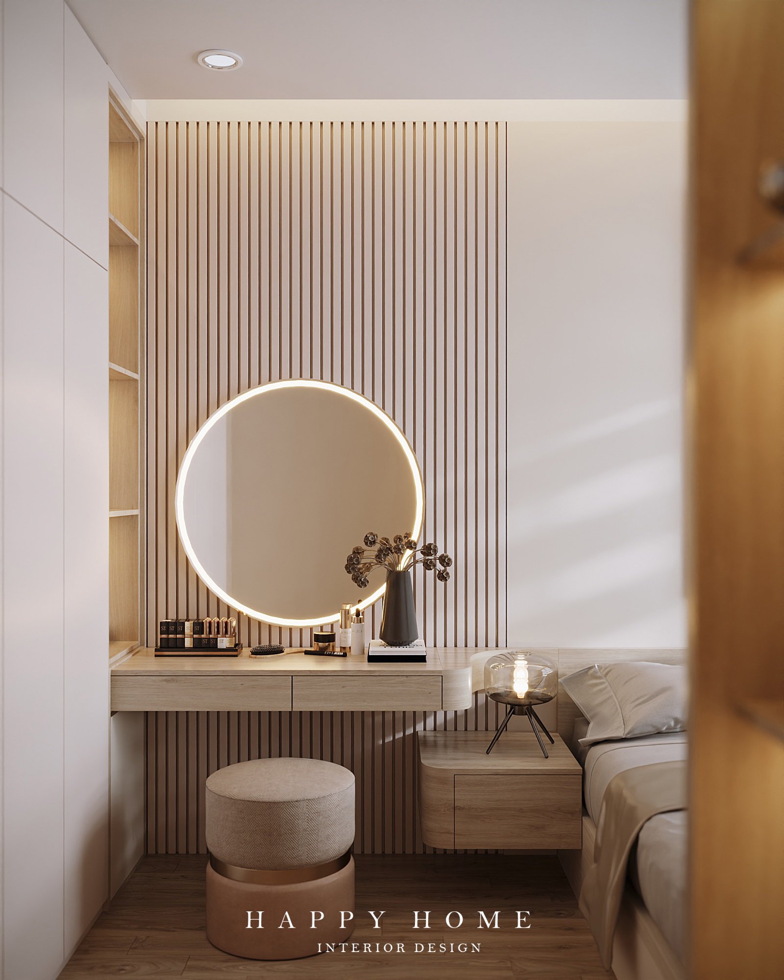 Gương và bàn trang điểm được đặt cạnh giường bạn có thể tự tin trang điểm mỗi sáng mà không cần phải di chuyển xa