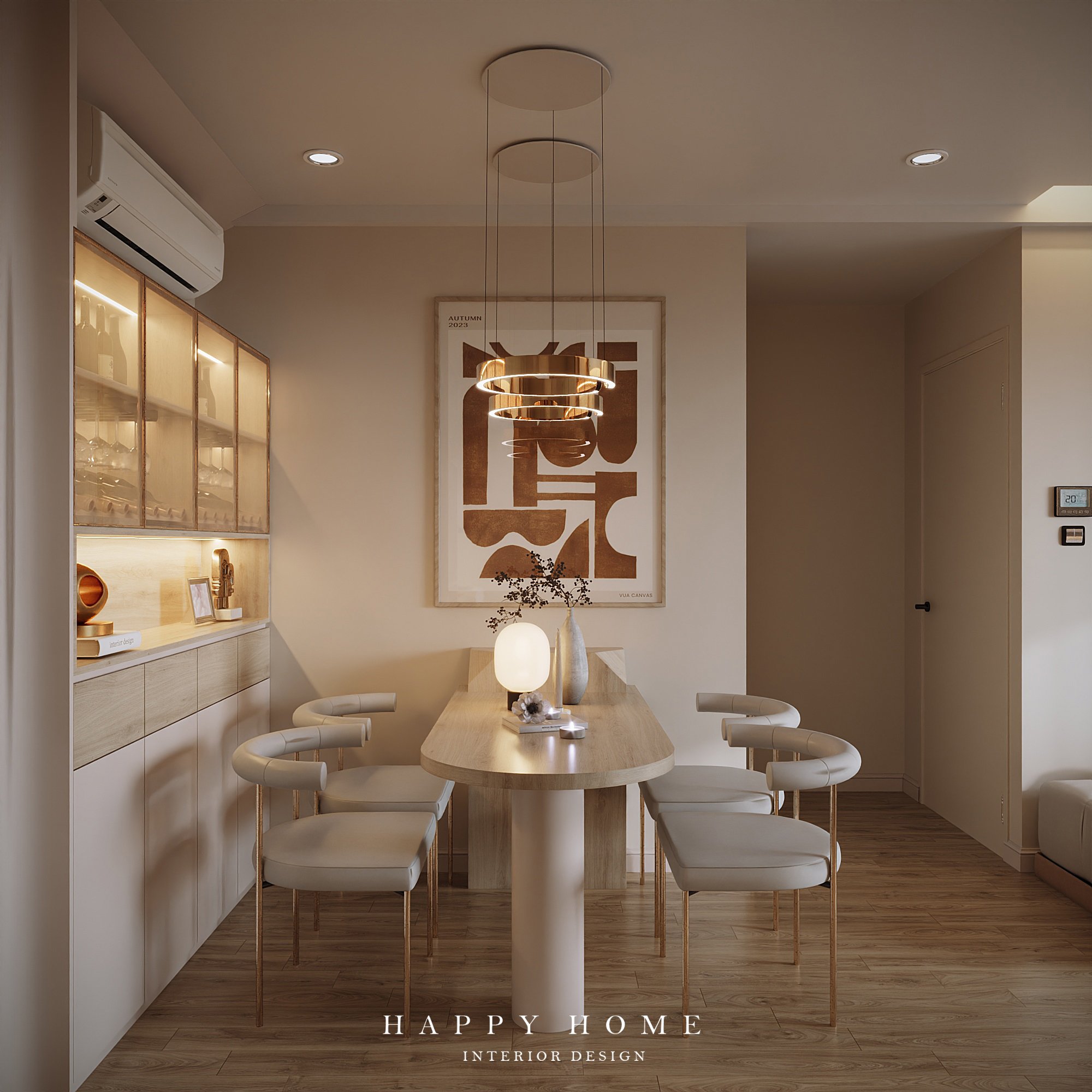 Bàn ăn và tủ rượu cùng tone xinh xắn