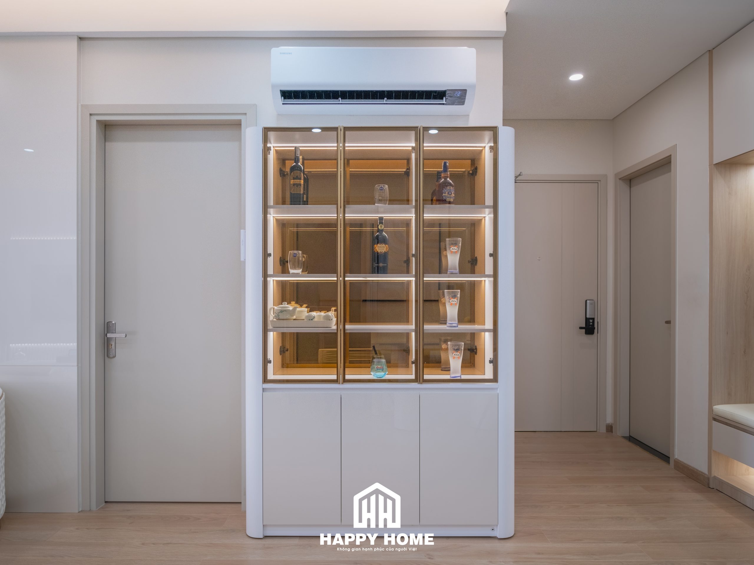 Tủ rượu được làm hiện đại, phần trên cánh kính và phần dưới cánh kín có thể phục vụ nhu cầu của gia chủ muốn trang trí các chai rượu quý của gia đình đồng thời vẫn có tủ kín rộng đựng đồ như một chiếc kho thu nhỏ